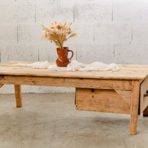 La table basse de ferme, c’est un meuble vintage un peu spécial. Le salon dans les fermes c’est pas ce qui courait les rues. Les meubles de fermes, c’étaient surtout des meubles anciens robustes faits par des artisans à l’ancienne. Ils étaient faits en bois massif, fonctionnels et surtout avec pragmatisme : Bonjour le circuit court avec le bois de la forêt du coin débité par la scierie elle aussi du coin. Alors pour le coup, le salon scandinave avec le tapis en laine, le canapé Maison du Monde et la table basse de chez Rochebobois, ça courait pas les rues !