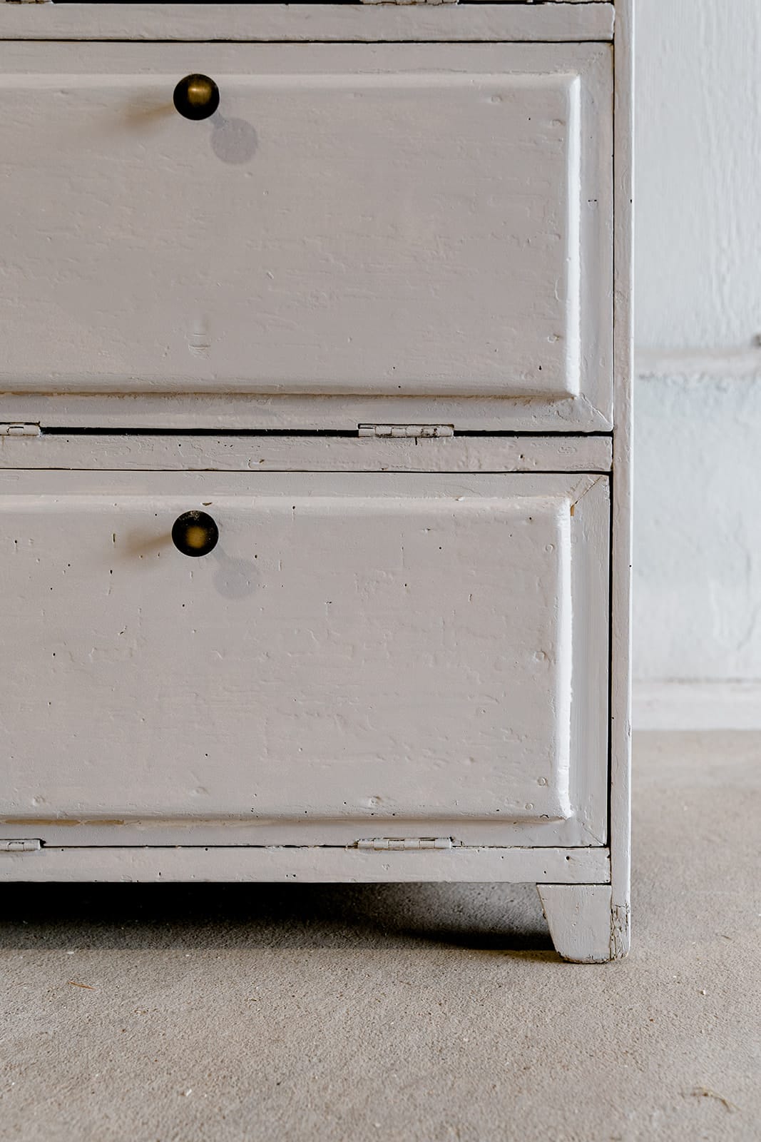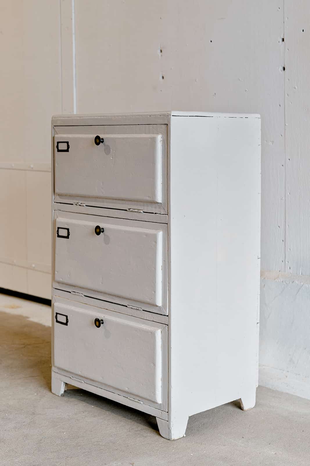 Joli chiffonnier chiné et revisité par mes soins. Je l’ai poncé et peint avec une peinture écologique de couleur sable. Le plateau est repeint également en taupe et l(intérieur également.