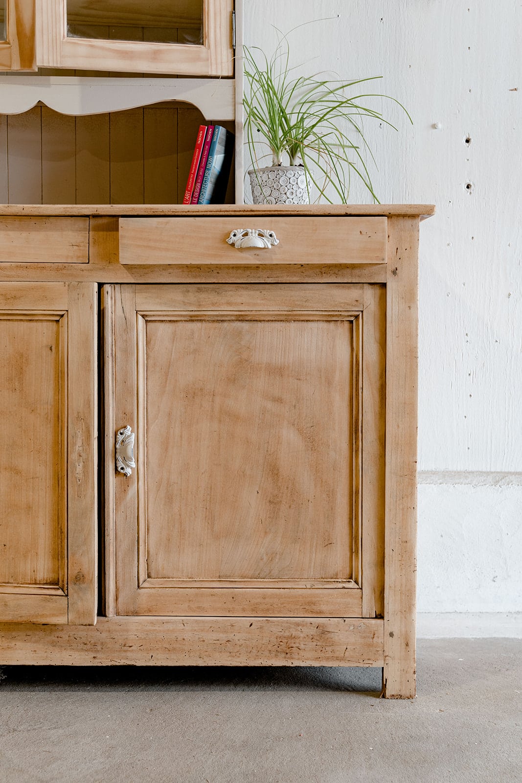 Buffet en bois brut, années 1960. Meuble sans pieds munie de deux tiroirs avec de sublimes poignées coquille en font blanche.