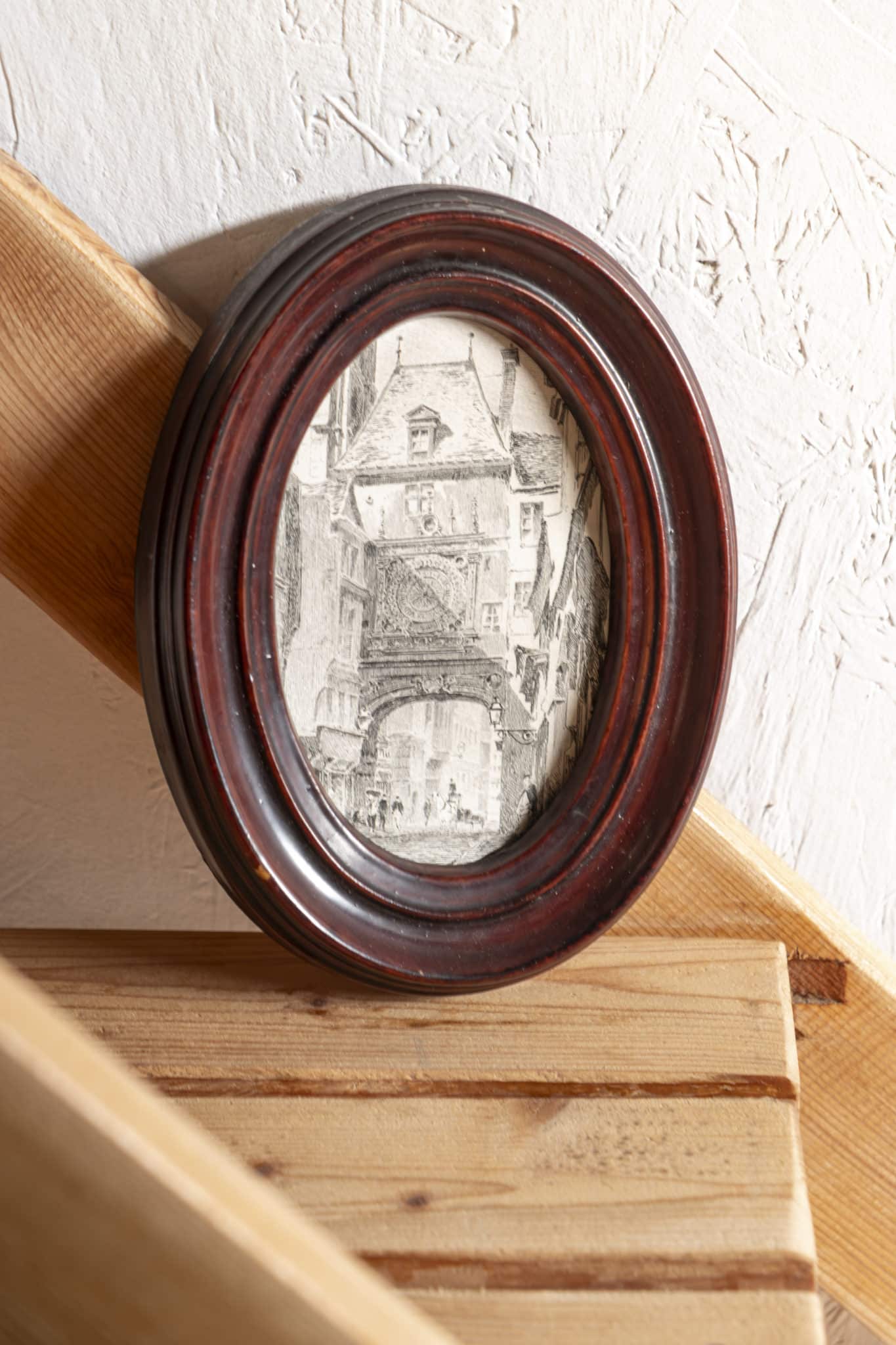Élégant cadre ovale en bois, mettant en valeur une illustration de Rouen en gravure. Une pièce raffinée et intemporelle, qui capture le charme architectural et historique de la ville à travers un dessin fin et détaillé.