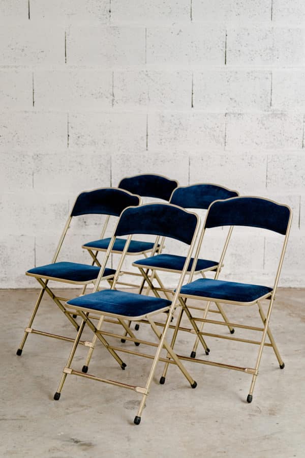 Chaise vintage structure en acier doré. L’assise et le dossier sont en velours d’un joli bleu -> lumineux. On aime beaucoup ces chaises qui se plient facilement, et qui font un maxi effet. On peut voir de l’oxydation en tout petit point dans sur la structure. Chaise pliante, structure dorée.
