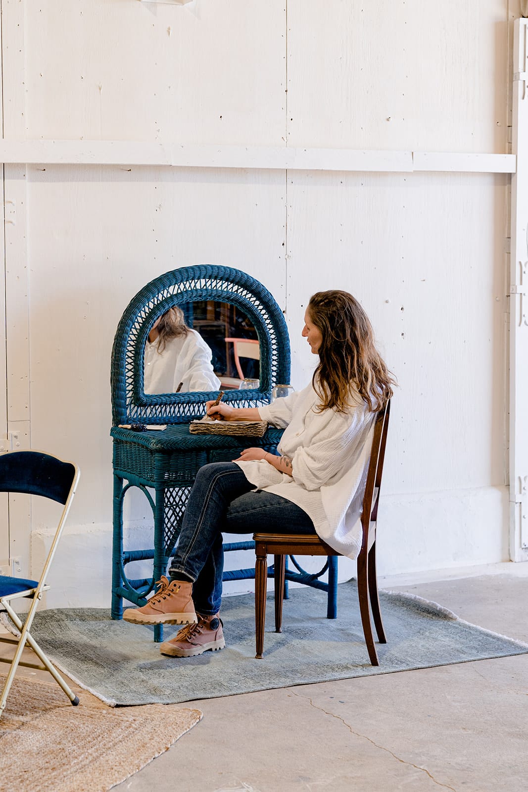 Coiffeuse des années 1970-80 – vintage – à 1 tiroir, rotin peint par nos soins dans notre atelier / brocante.