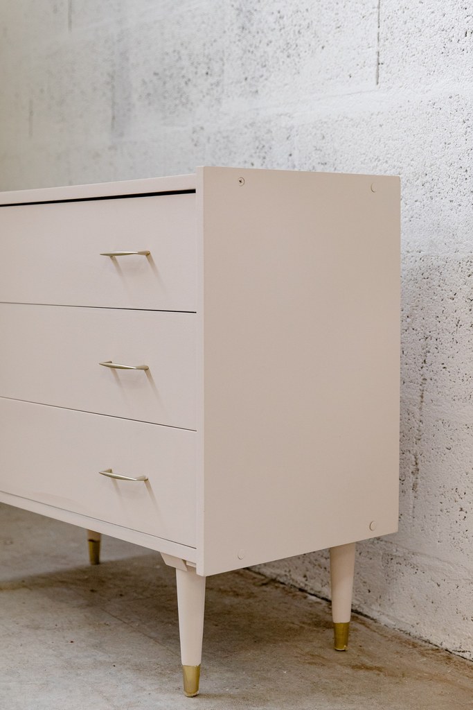 Commode chic 4 tiroirs des années 60-70 avec pieds compas. Cette belle pièce que j’ai entièrement refaite : poncée, nettoyée, et repeinte avec une belle peinture nuée de chez RESSOURCES PEINTURES. Elle est dans un très bel état -> les tiroirs coulisses comme si ils étaient neufs. J’aime beaucoup cette petite commode pleine de charme avec ses poignées & bas de pieds dorées.