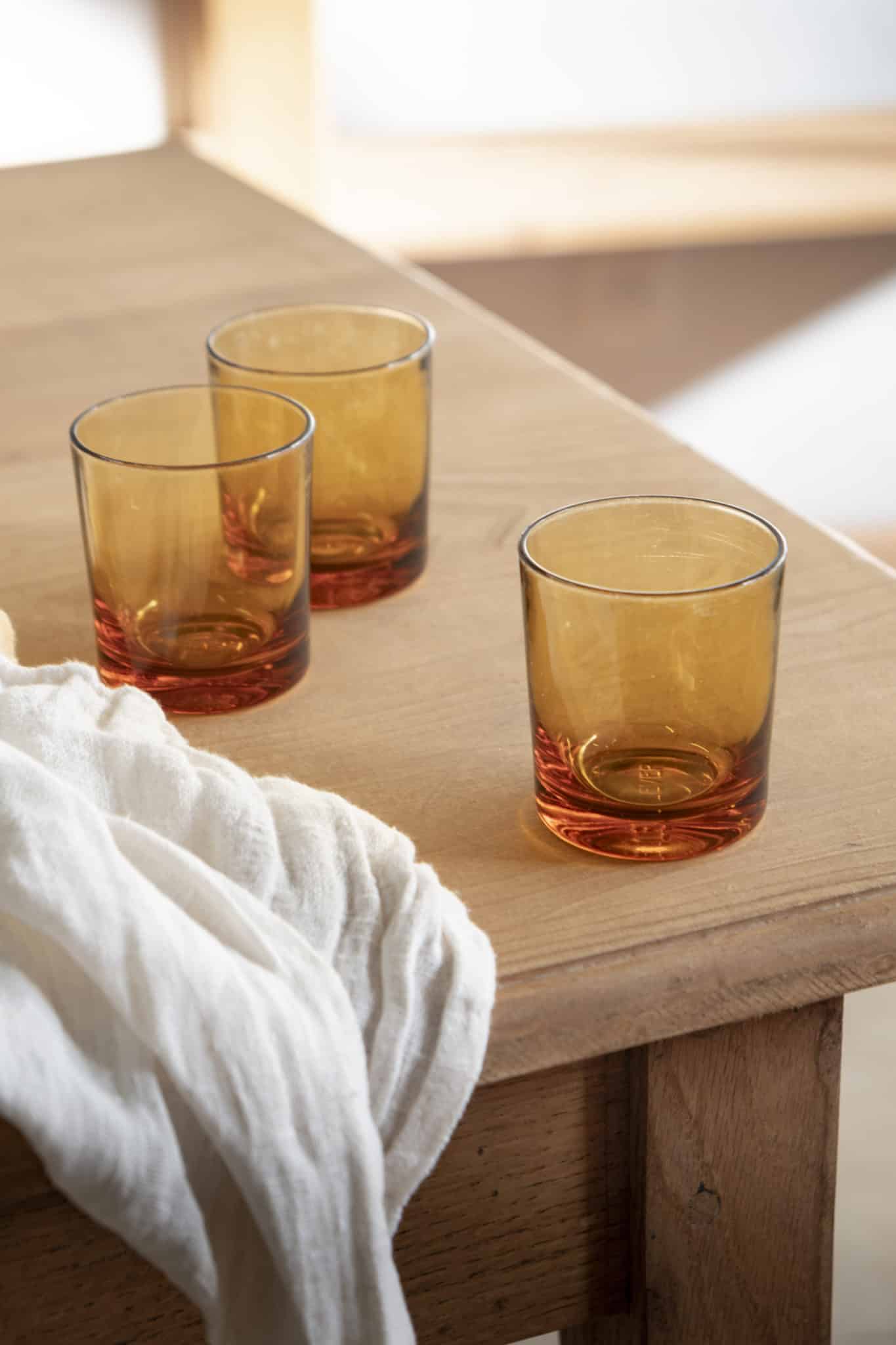 Solaires et pleins de caractère, les verres en verre jaune « Nicole » insufflent une touche seventies à la table. Leur teinte chaude capte la lumière et apporte instantanément de la bonne humeur, tout en restant faciles à associer. Un trio parfait pour le quotidien comme pour des moments plus festifs.