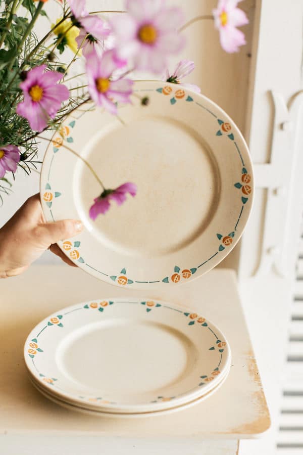 Liseré / ornements vert et orange. Vaisselle vintage années 40. Très bon état, des petits défauts.