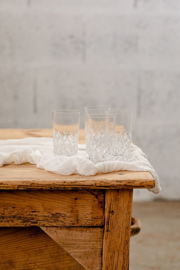 Verres en cristal moulé pour la dégustation des spiritueux purs, sur glace, en cocktail, grâce à une descente de verrerie complète et ornée d’une taille généreuse et géométrique pour un bonne prise en main. Idéal pour les rafraîchissements ou les créations longdrinks. Très bon état, Ensemble de 4 verres lourds et cossus pour une résistance et une durabilité supérieure. Hauteur: 13 cm.