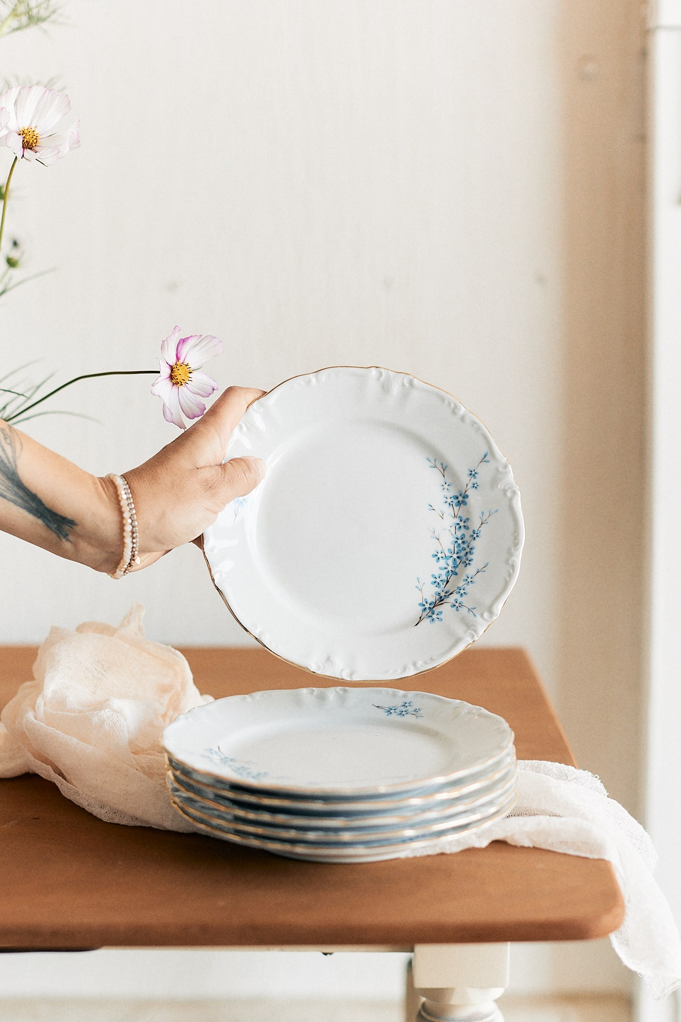Lot de 6 assiettes bleues avec de très fin décors fleuris / bord doré