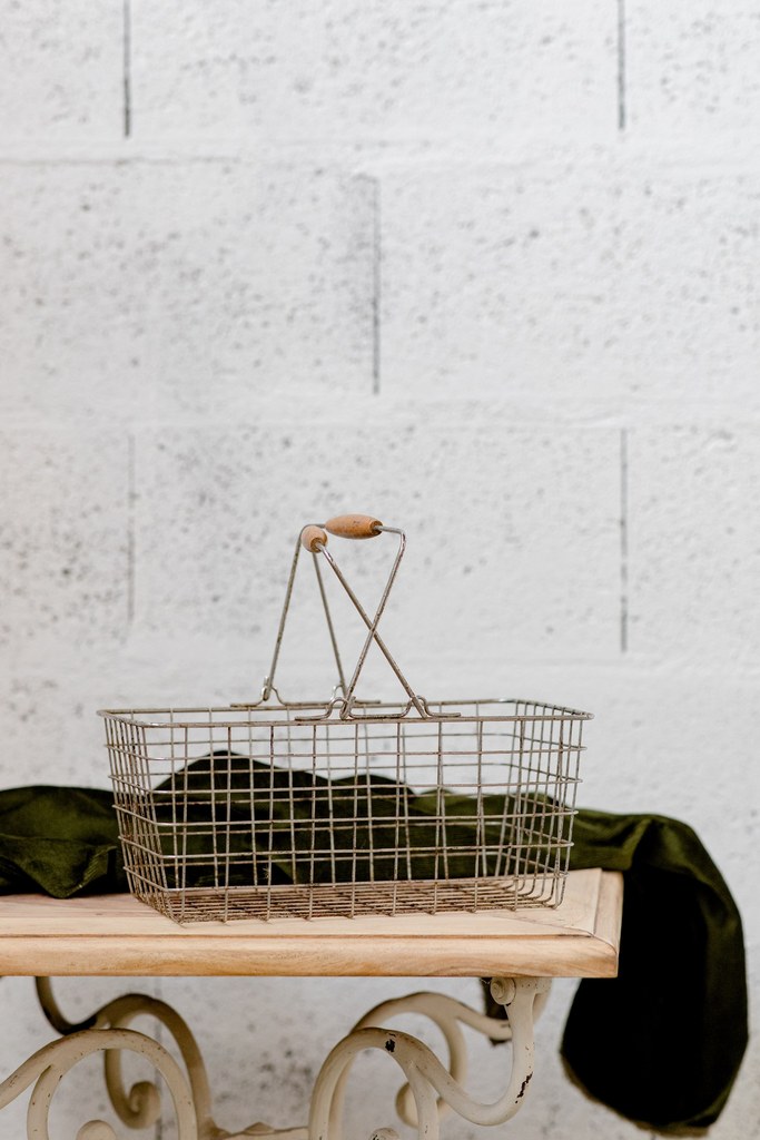 Panier à anse vintage en métal. Le haut de l’anse est recouvert d’un joli bois caramel.