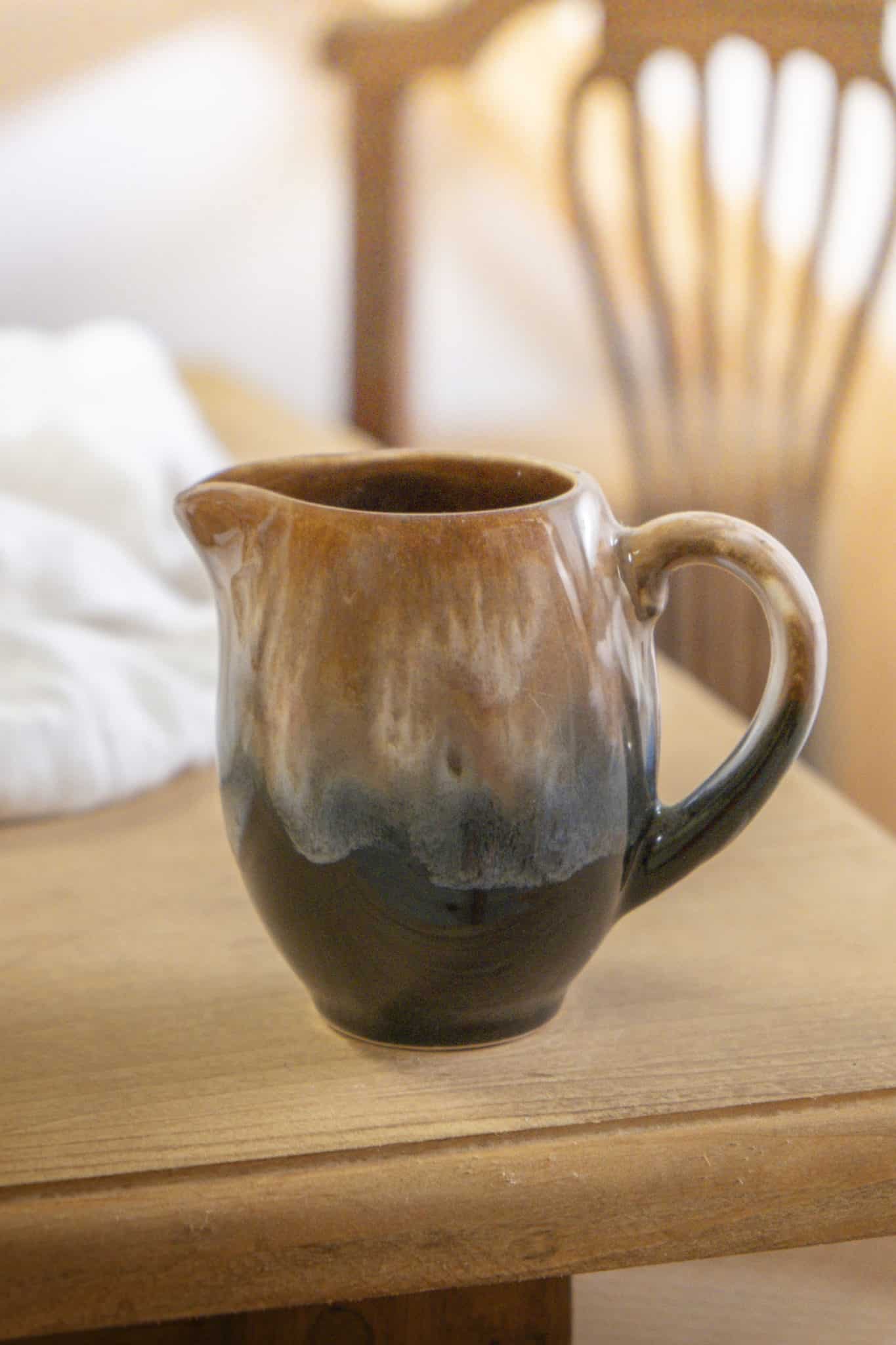 Charmant petit pot à lait, aux teintes chaleureuses de caramel contrastées par un bleu nuit profond. Une pièce à la fois fonctionnelle et décorative, idéale pour accompagner un service à café ou à thé, ou être détournée en petit objet déco plein de caractère.