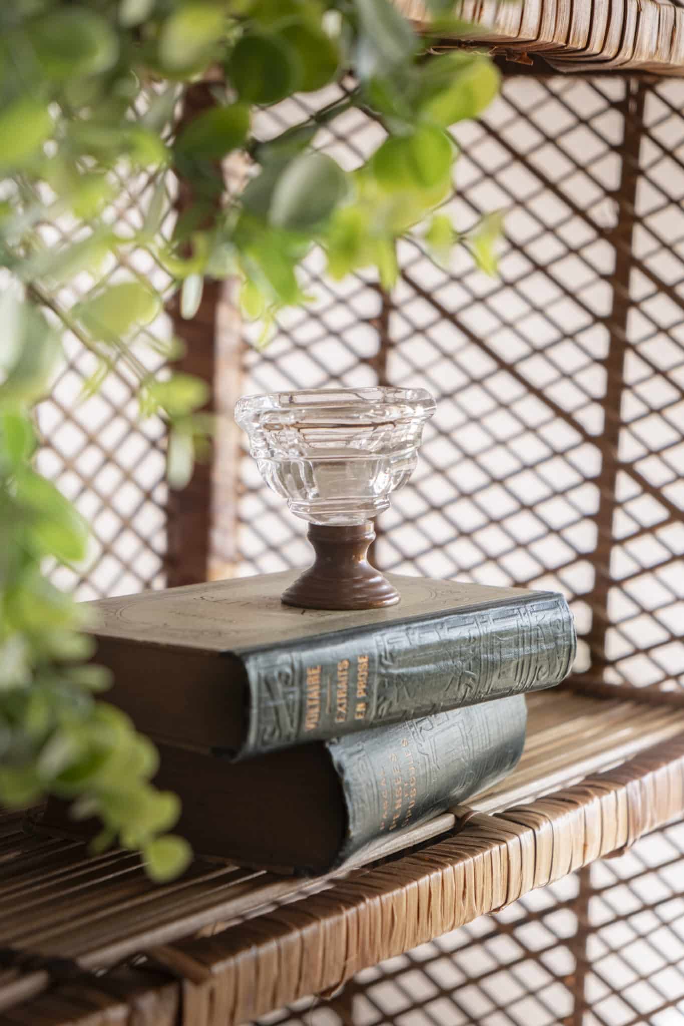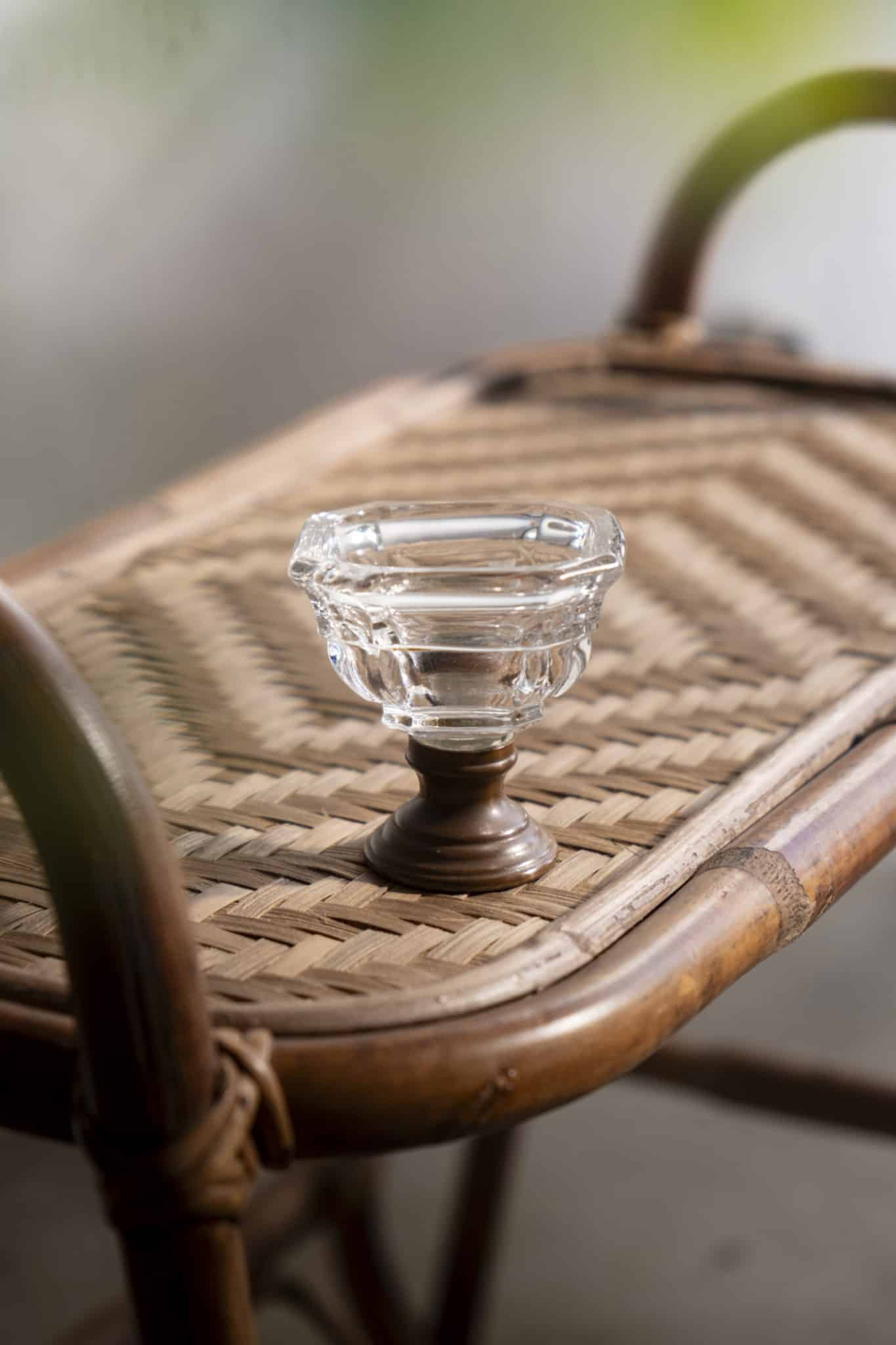 Petit récipient en verre blanc reposant sur un pied en métal vintage. L’association du verre et du métal lui donne beaucoup de caractère et un charme discret.