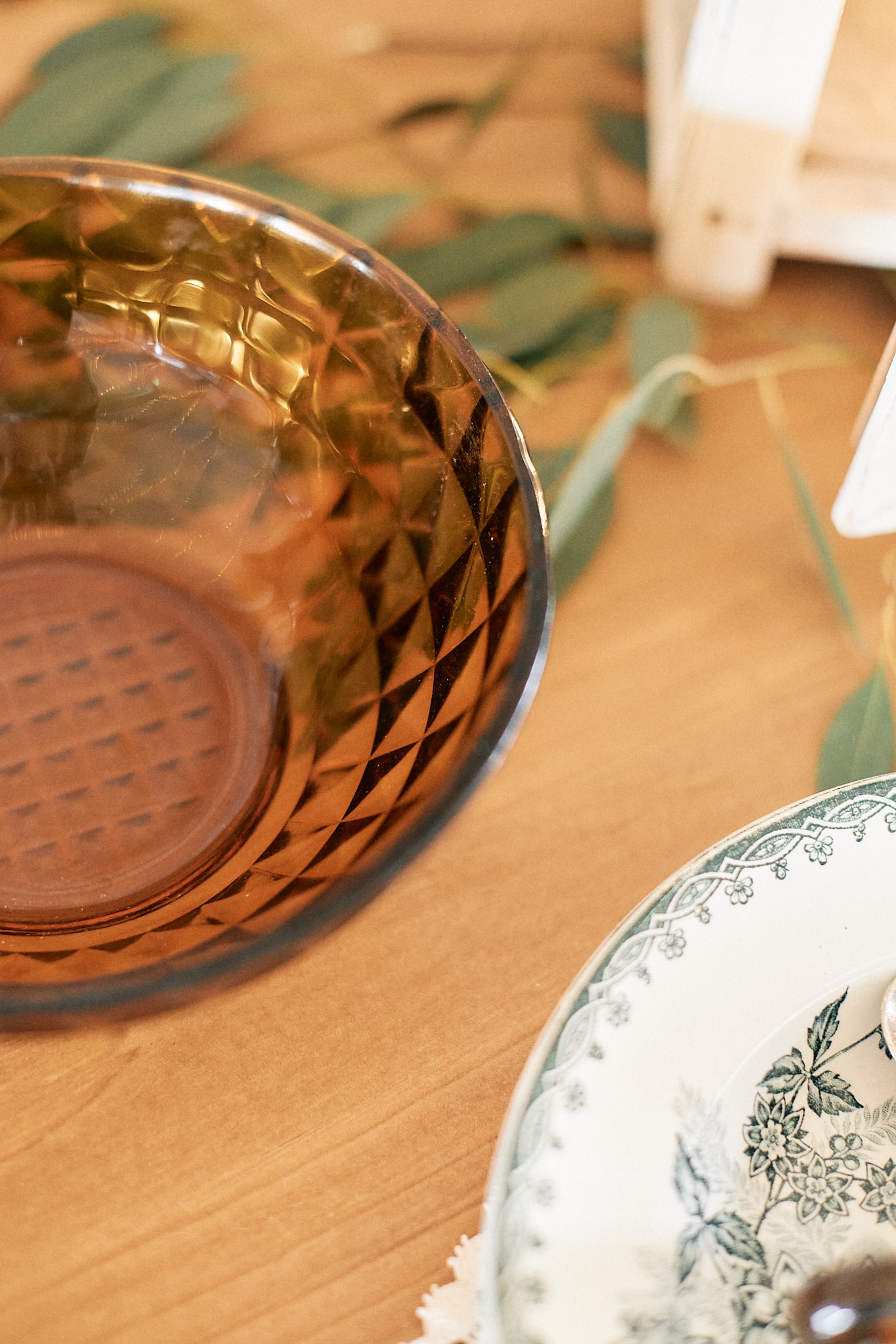 Jolie trouvaille en verre ambré assez épais – en guise de saladier / coupe à fruits