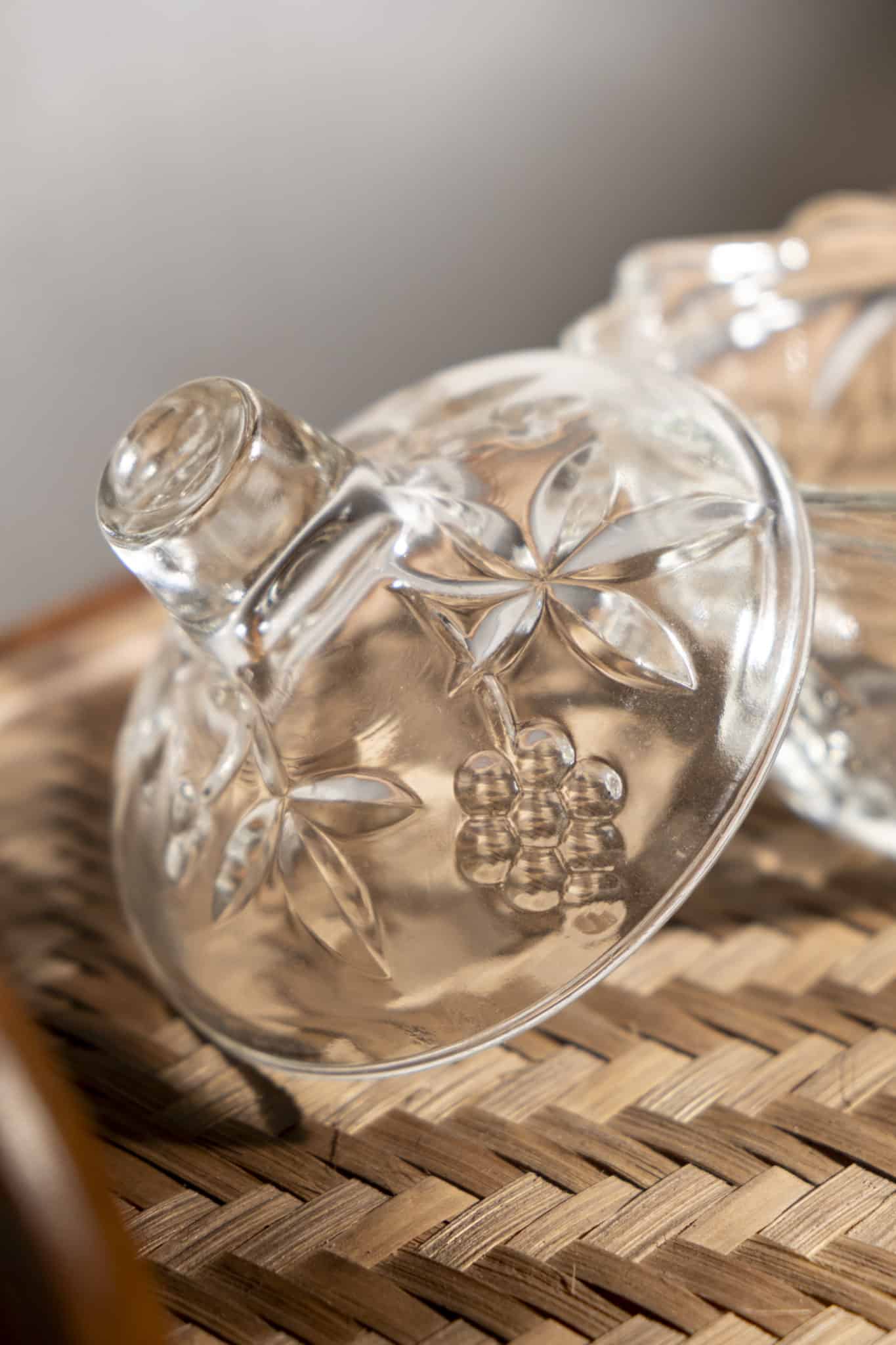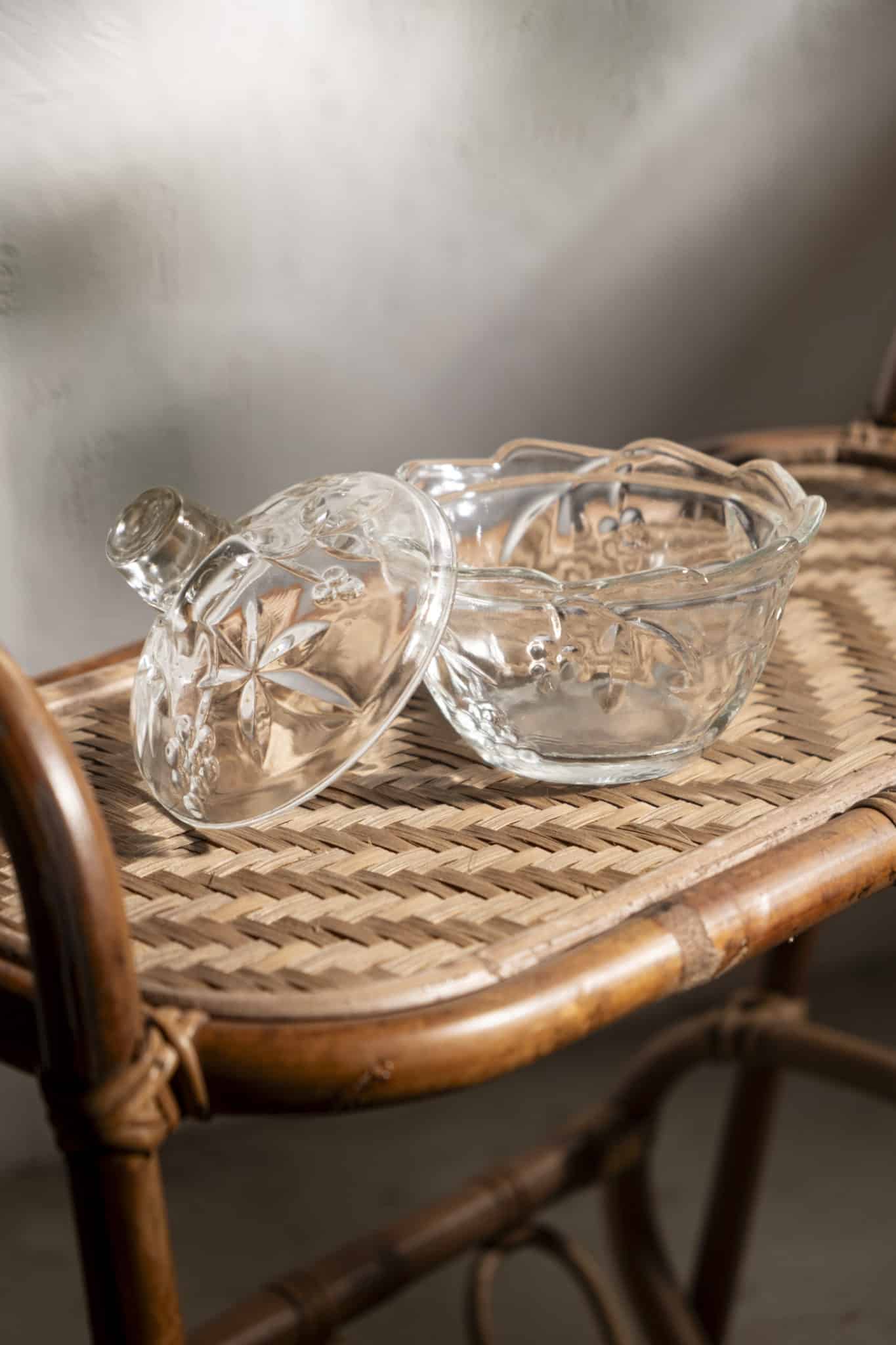Joli récipient en verre blanc ciselé avec son couvercle assorti également en verre ciselé. Le décor travaillé dans la matière représente un motif de vigne, qui lui donne beaucoup de charme et de relief.