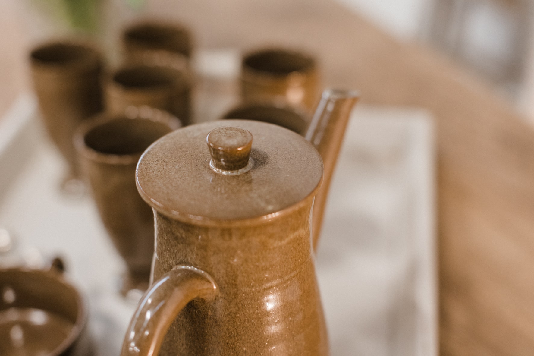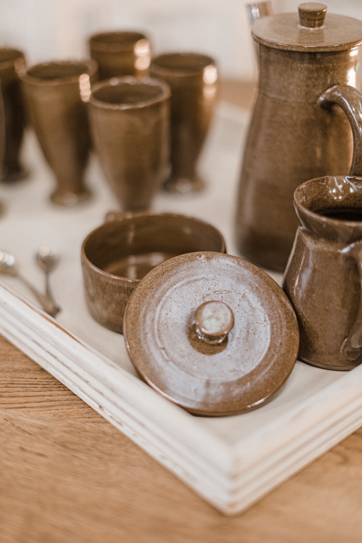 Service à café en grès émaillé grès couleur taupe -> Une cafetière, un sucrier, un petit pichet, et 6 mazagrans