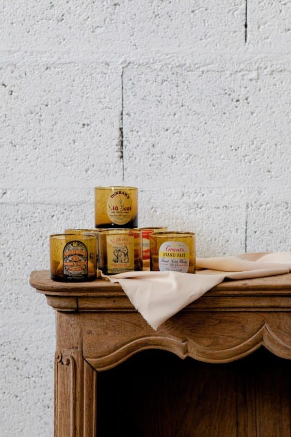 6 verres publicitaires à liqueur en verre de couleur ambre vintage 1970. Verres à eau – > Publicité sur le thème du whisky sur les verres. Bouchon de la carafe en bois. État d usage bon à très bon etat.