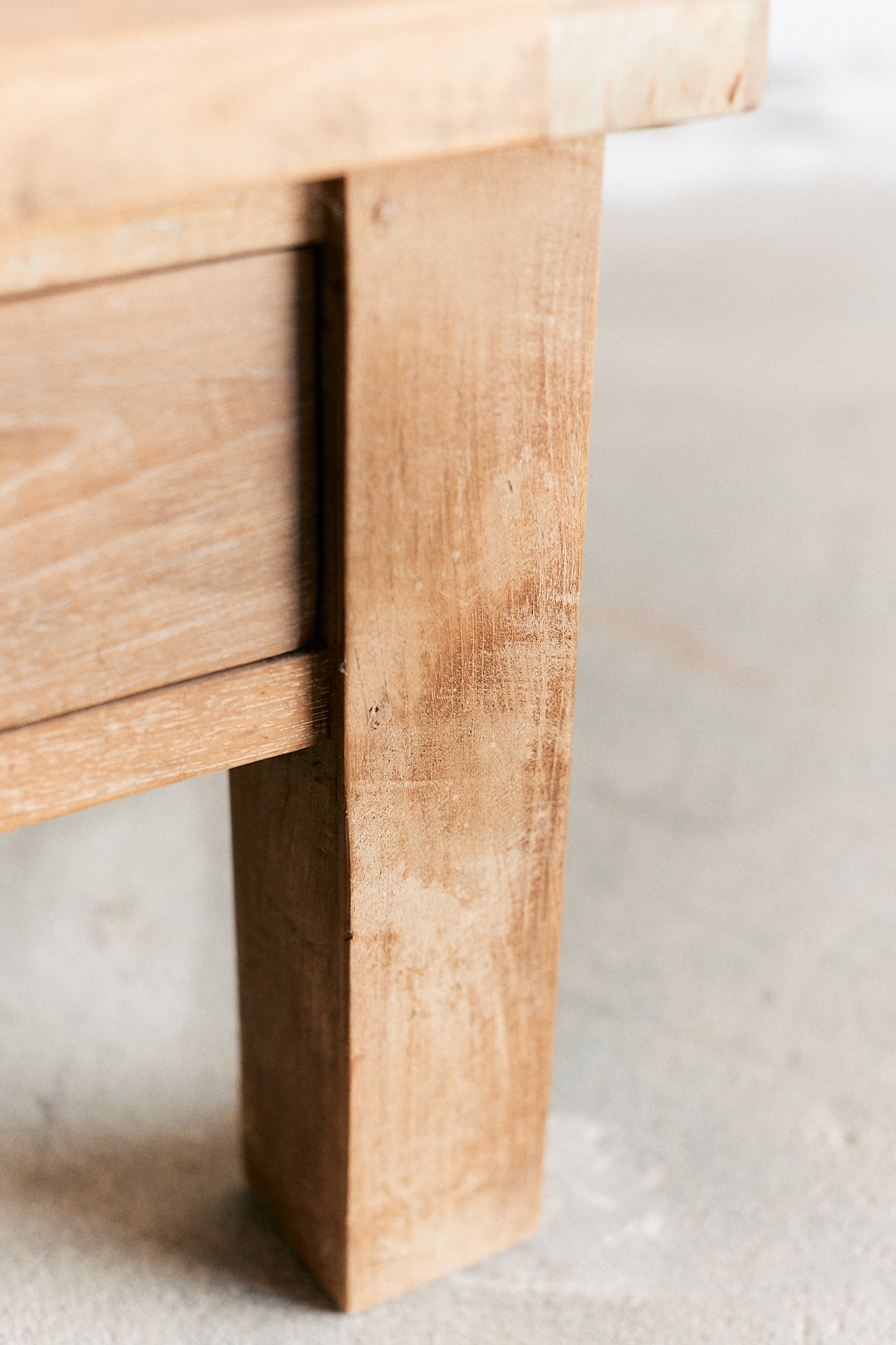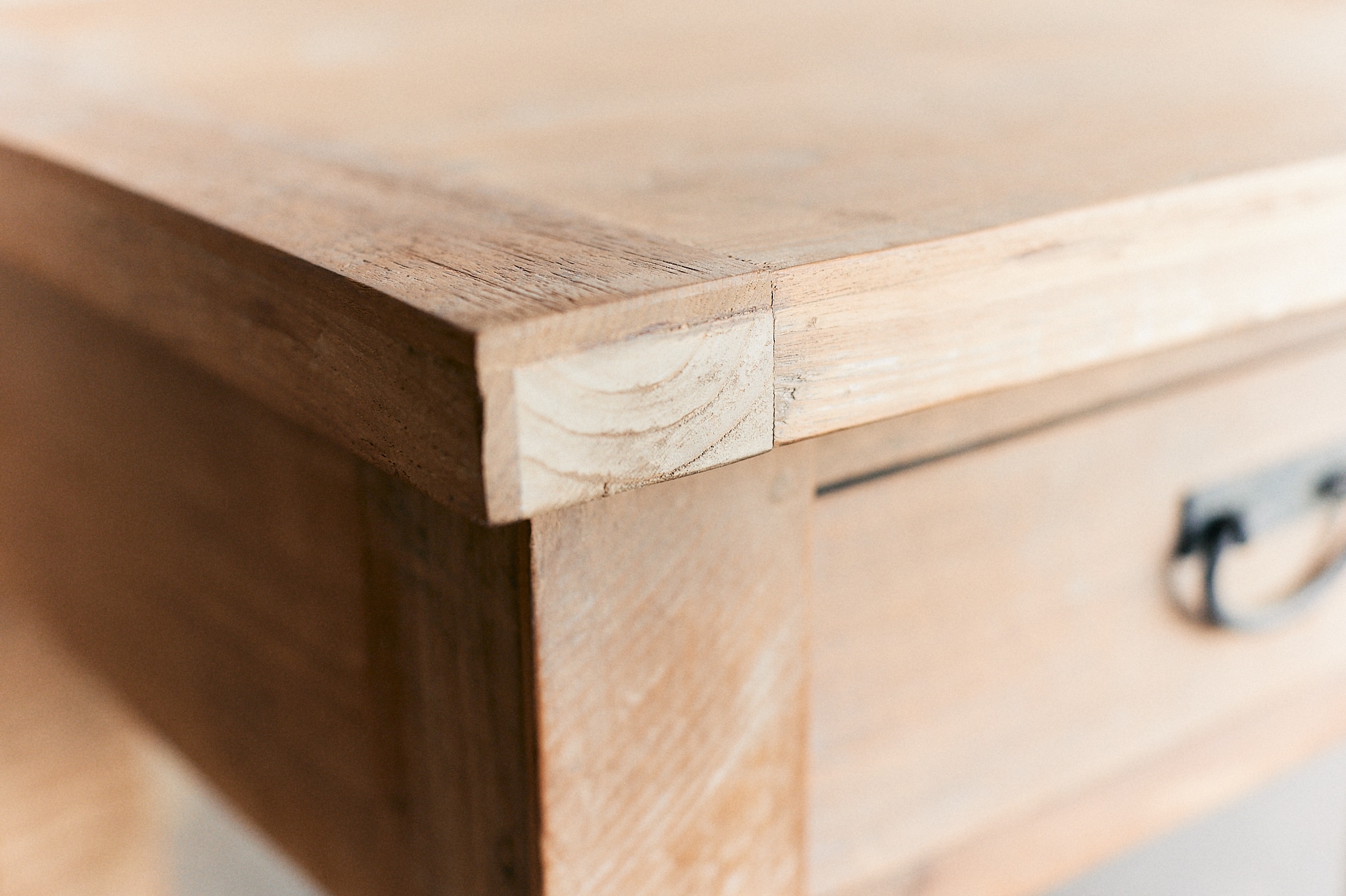 Jolie table bois massif brut de format carrée avec un tiroir et une belle poignée en fonte noire. Plateau protégé.