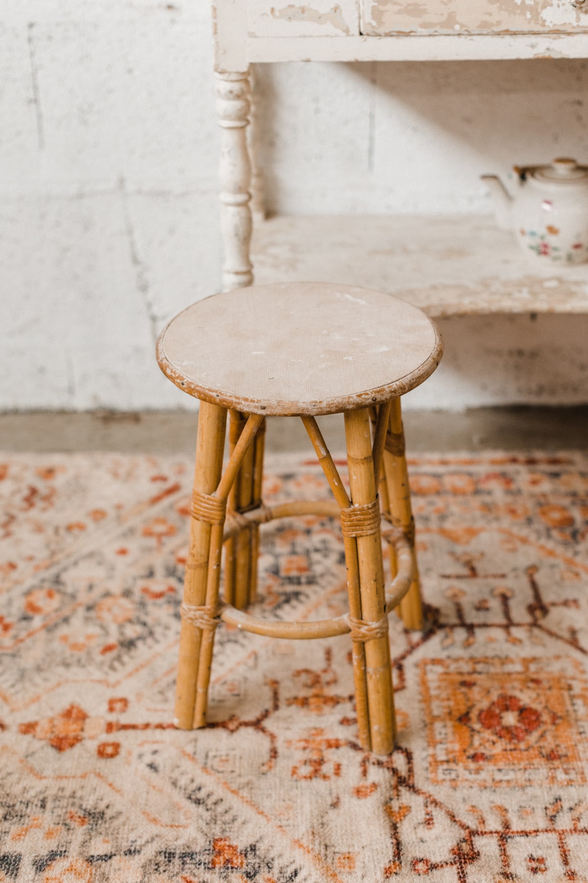 Un bien joli tabouret en rotin et bambou, vintage à souhait, patiné par le temps et en très bon état général !