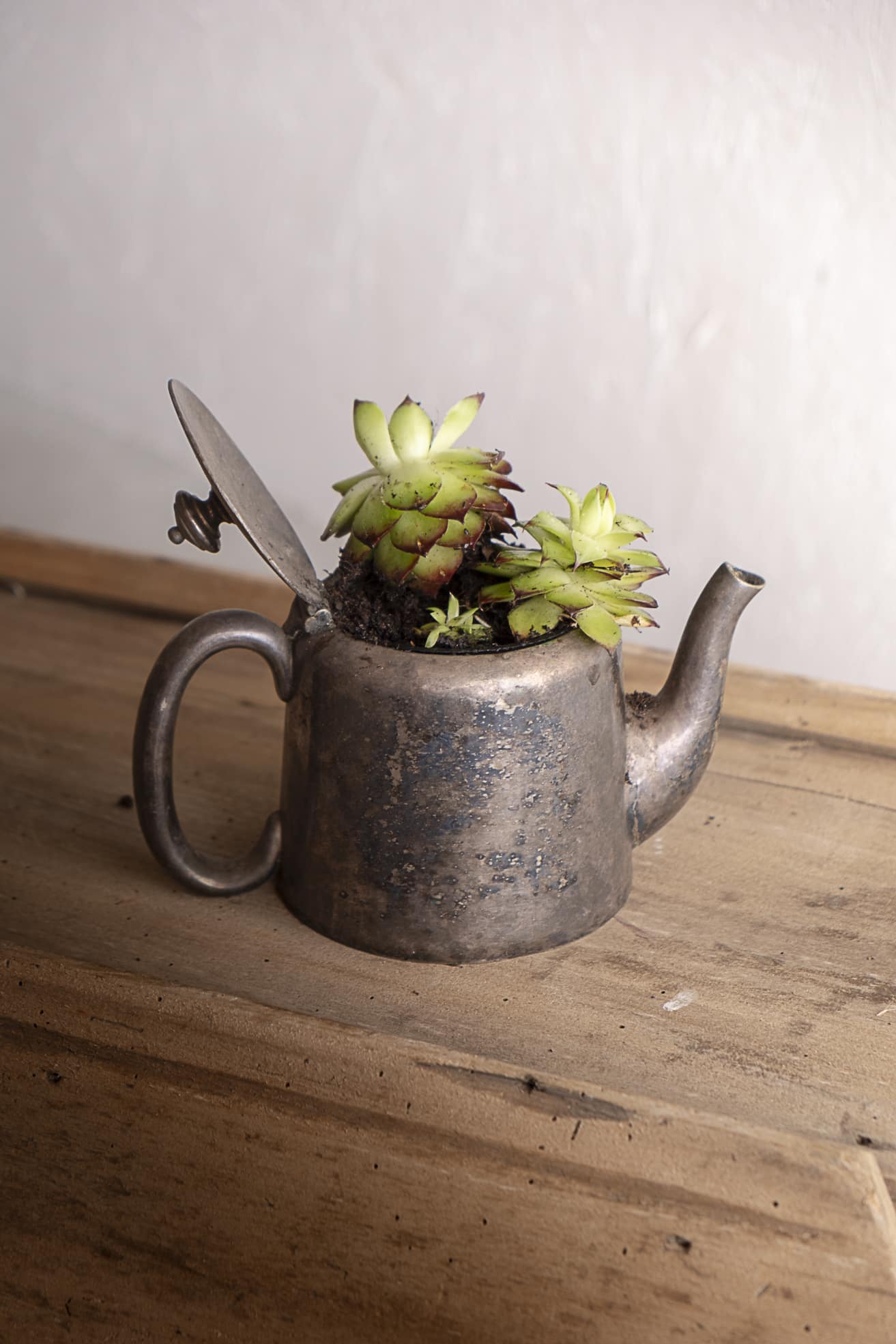 Théière en métal patinée par le temps, apportant charme et authenticité. Détournée en cache-pot, elle est vendue avec une plante incluse, prête à être installée.